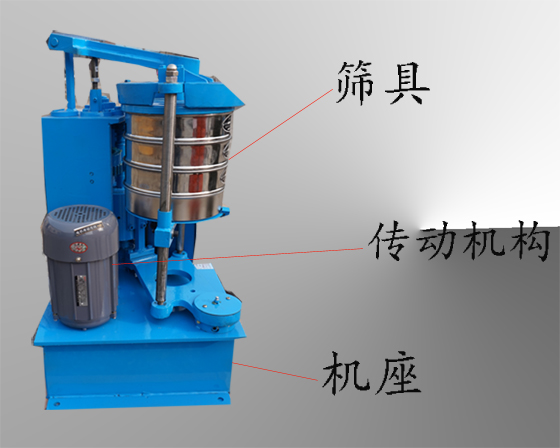 電機帶動齒輪通過同步帶傳動到主軸上,經齒輪變速后主軸按要求的轉速轉動,主軸帶動偏心輪使滑板做往復運動,帶動安裝在滑板托盤中的試驗篩左右搖動,同時主軸帶動頂桿齒輪轉動,變速后頂桿齒輪通過凸輪頂擊頂桿,頂桿使拍錘上下拍擊試驗篩上蓋,使得試驗篩、分樣篩中的物料往復和上下振動,使小于標準試驗篩篩面網孔的物料顆粒篩分進下層試驗篩,如此層層篩選,使每層試驗篩內只留相同粒度的物料。達到不同粒度的分離并確定此物料的粒度組成。