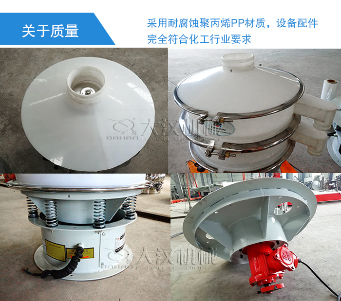 好的質量能夠讓您的設備使用更長久,減少后期維修費用,而且設備在篩分效果上也是有別于劣質設備的,大漢化工振動篩采用耐腐蝕聚丙烯PP材質,完全符合化工行業的要求,設備在做工上也是相當精細的,所有設備配件的選擇均按照化工行業的安全標準,設備使用更安全。